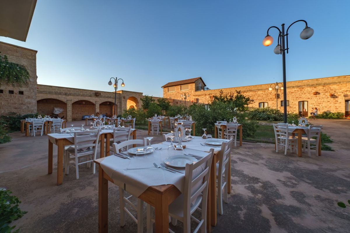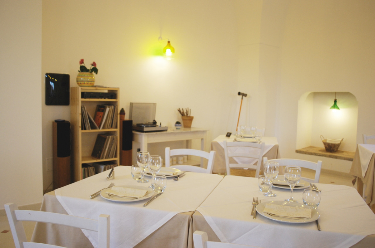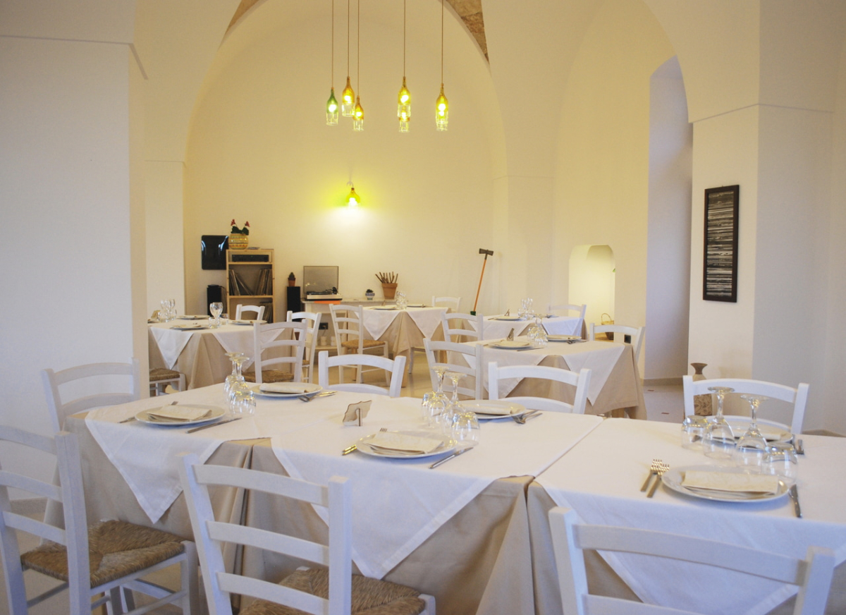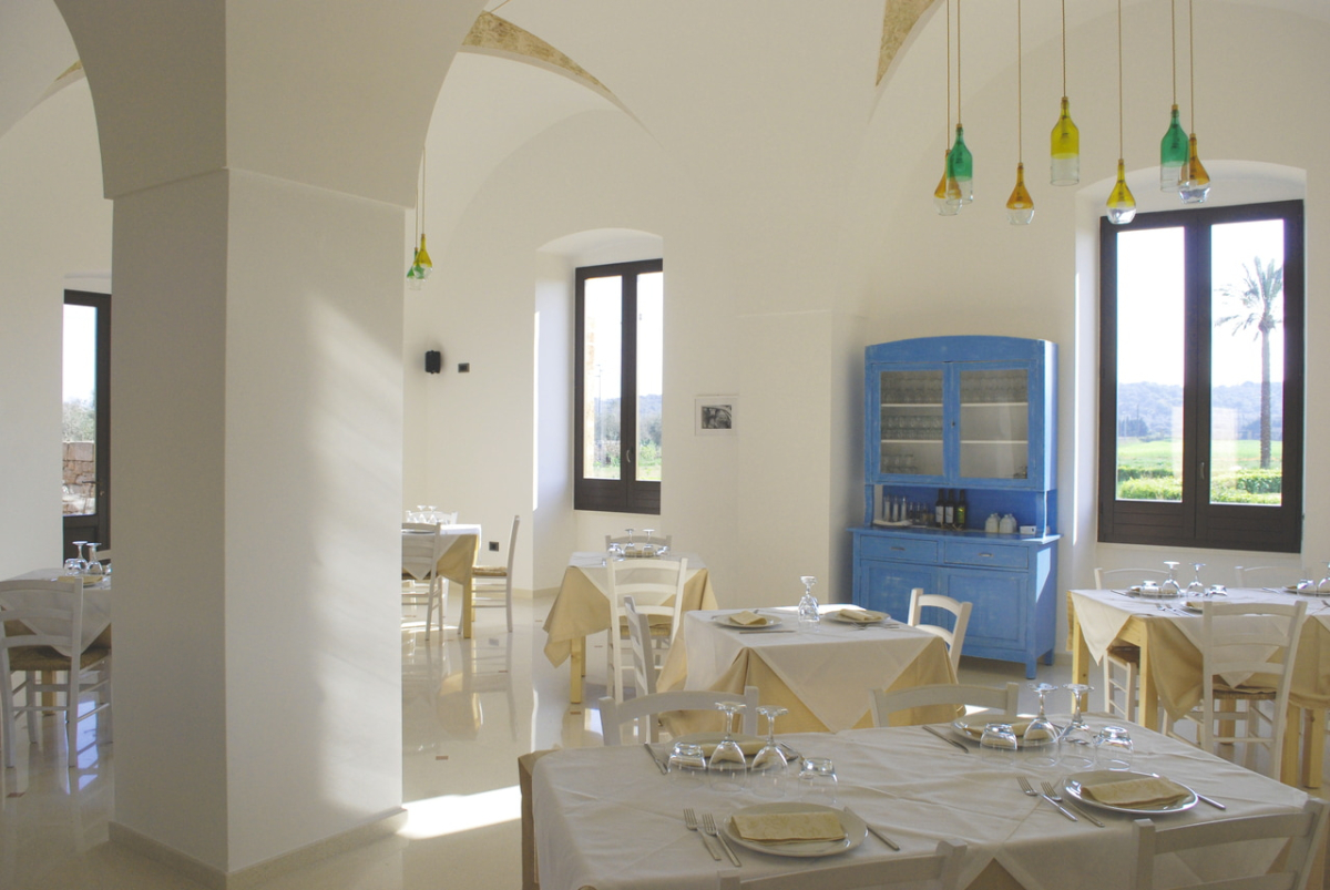 Il ristorante trova spazio nell’accogliente e luminosa sala interna un tempo destinata alle lavorazioni agricole che si svolgevano nella masseria. Durante la stagione estiva i tavoli sono disposti all’esterno nella caratteristica corte centrale, tra profumate piante di cappero e rigogliosi arbusti di mirto, melograno, ginestra e corbezzolo. Un’atmosfera romantica nella sua semplicità.